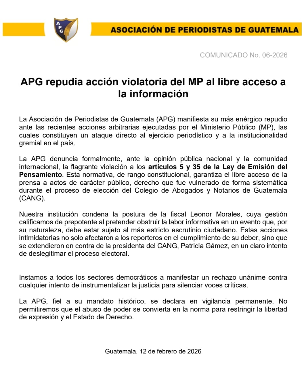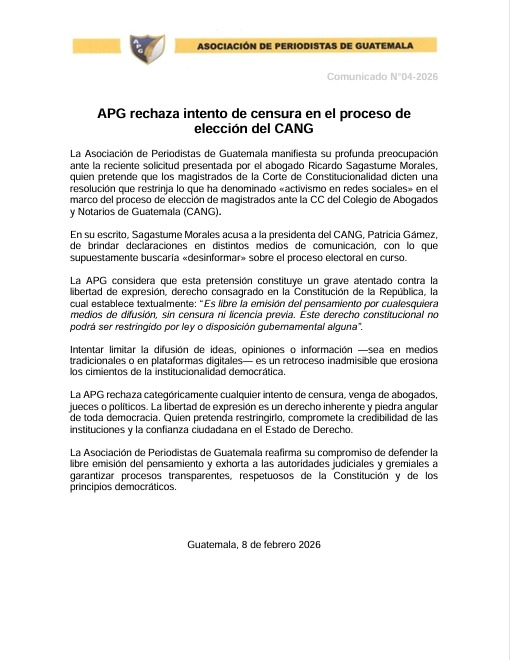 La Asociación de Periodistas de Guatemala (APG), ante los hechos y la coyuntura nacional marcada...