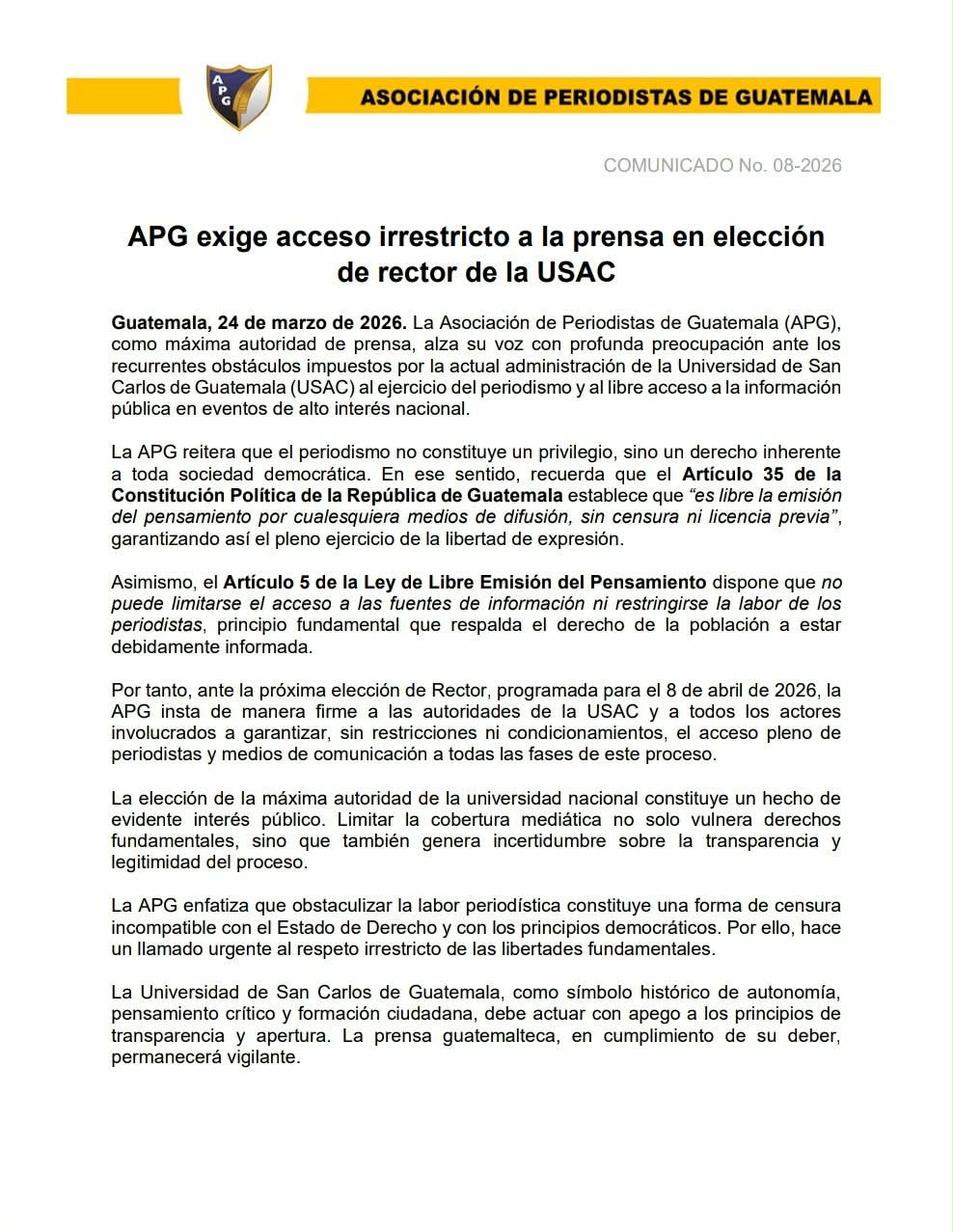 La Asociación de Periodistas de Guatemala (APG), institución con 79...