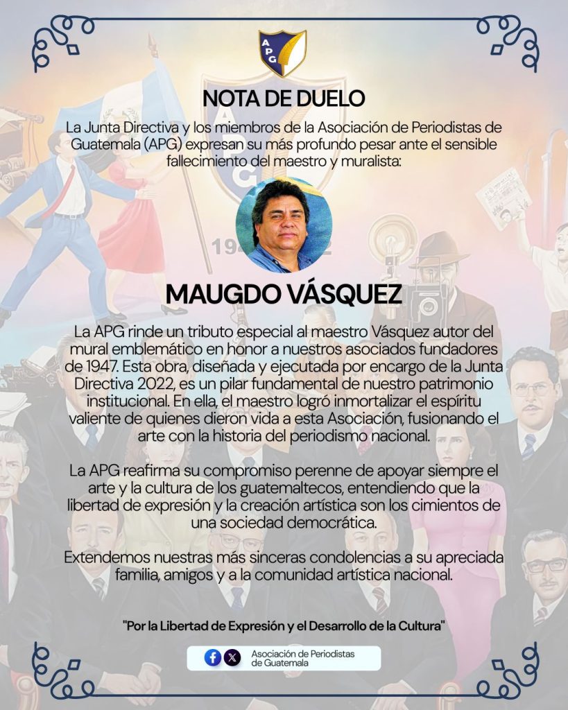 La Junta Directiva y los miembros de la Asociación de Periodistas de Guatemala (APG) expresan su más profundo pesar ante el sensible fallecimiento del maestro y muralista guatemalteco Maugdo Vásquez, cuya obra forma parte esencial del patrimonio institucional de esta Asociación.