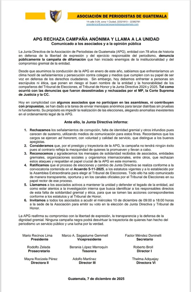 APG RECHAZA CAMPAÑA ANÓNIMA Y LLAMA A LA UNIDAD Comunicado a los asociados y a la opinión pública La Junta Directiva de la Asociación de Periodistas de Guatemala (APG), entidad con 78 años de historia en defensa de la libertad de expresión y del ejercicio responsable del periodismo, denuncia públicamente la campaña de difamación que […]