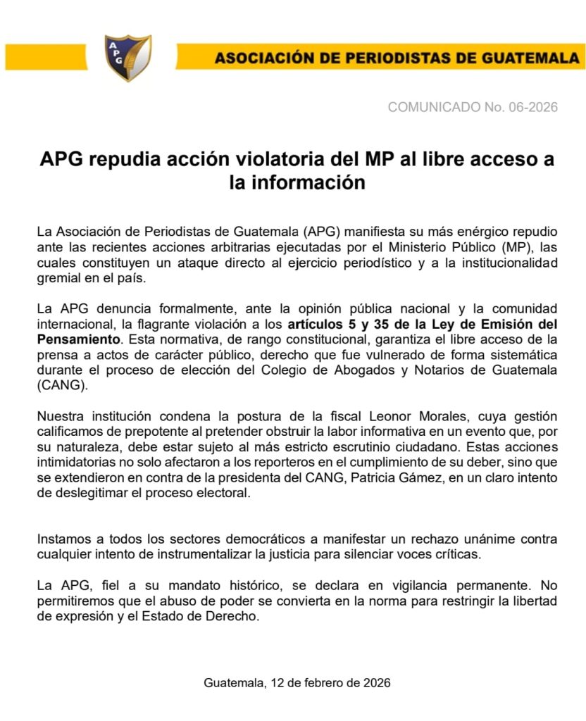 La Asociación de Periodistas de Guatemala (APG) manifiesta su más enérgico repudio ante las recientes acciones arbitrarias ejecutadas por el Ministerio Público (MP), las cuales constituyen un ataque directo al ejercicio periodístico y a la institucionalidad gremial en el país.