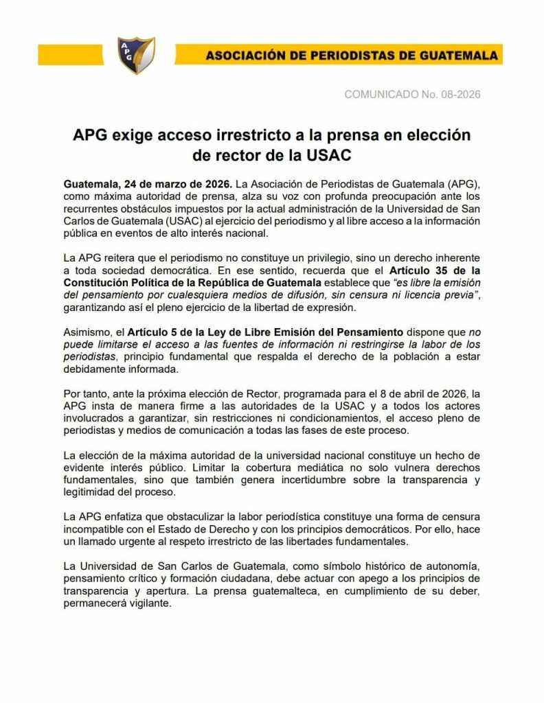 La Asociación de Periodistas de Guatemala expresa su preocupación por las restricciones al ejercicio periodístico en la USAC y recuerda que informar es un derecho fundamental en democracia. Ante la elección de rector del 8 de abril de 2026, exhorta a las autoridades a asegurar el acceso pleno y sin condicionamientos a periodistas y medios, […]