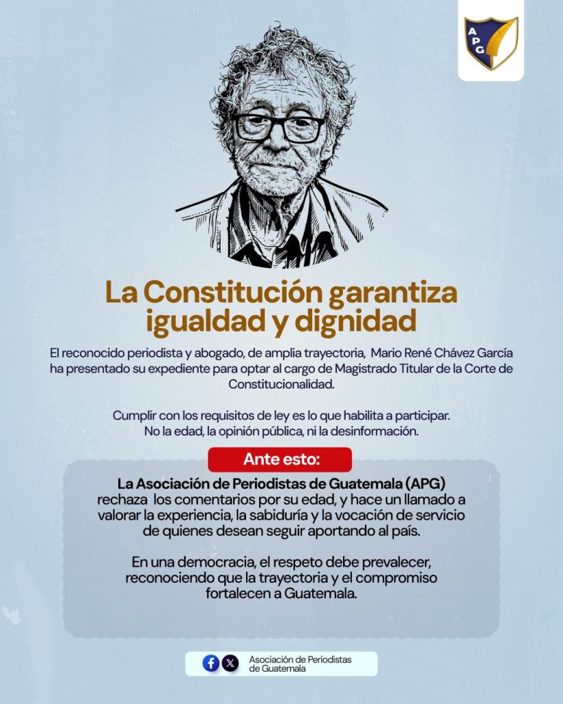 El reconocido periodista y abogado de amplia trayectoria Mario René Chávez García ha presentado su expediente para optar al cargo de magistrado titular de la corte de constitucionalidad, cumplir con los requisitos de ley es lo que habilita participar. No la edad, la opinión pública, ni la desinformación. Ante esto. La Asociación de Periodistas de Guatemala (APG) rechaza los comentarios por su edad, y hace un llamado a valorar la experiencia, la sabiduría y la vocación de servicio de quienes desean seguir aportando al país. En una Democracia, el respeto debe prevalecer, reconociendo que la trayectoria y el compromiso fortalecen a Guatemala”.